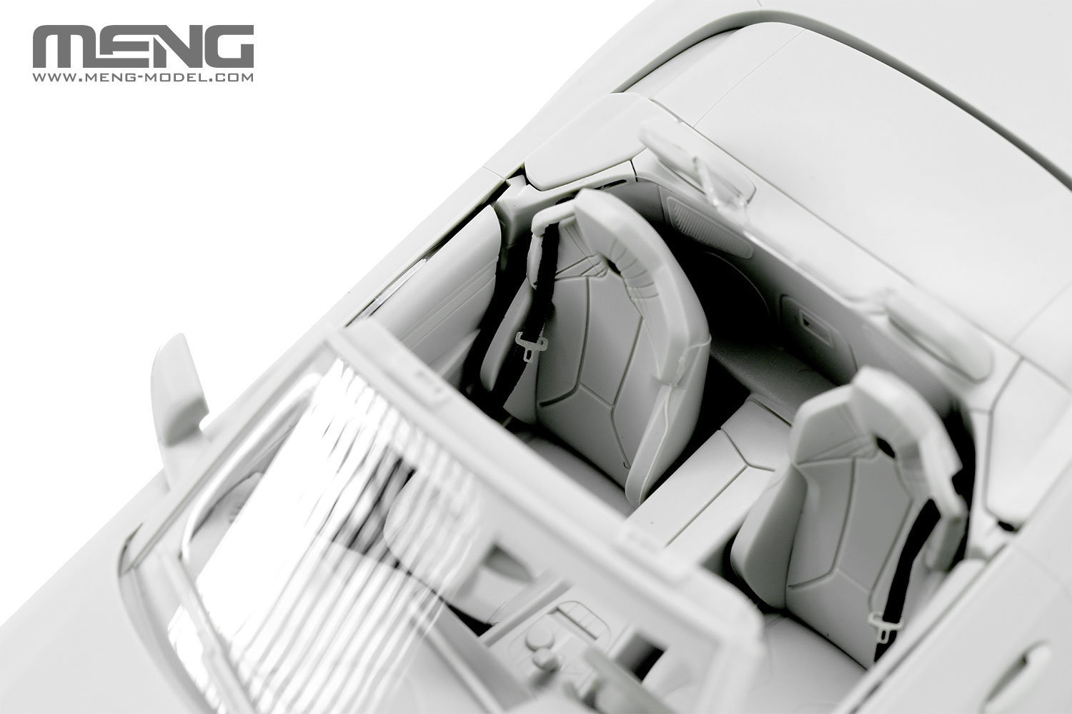 Plastikmodellbausatz eines deutschen Sportwagens, hier als Cabrio. Das Soft-Top kann offen oder geschlossen dargestellt werden, die Fronträder sind beweglich. Inklusive Metallteilen, Decal-Sticker, Vinyl-Reifen und Spiegelfolie für die Rückspiegel.