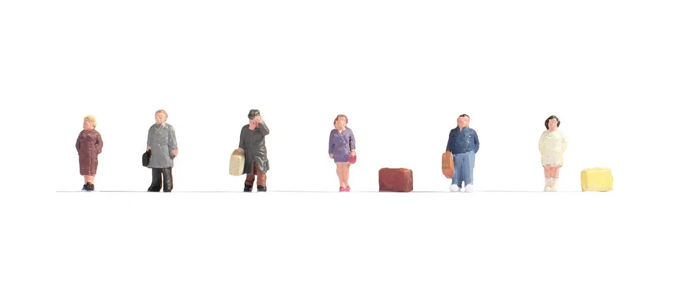 Das Modellfiguren-Set enthält sechs »Reisende«. Alle Figuren, davon drei Frauen und drei Männer, sind handbemalt und können ideal auf Bahnhöfen und Bahnsteigen eingesetzt werden. Sie haben alle einen Koffer oder Aktentasche bei sich, da sie sich entweder auf dem Weg zur Arbeit oder in den Urlaub befinden. Auch die Kleidung ist farblich sehr bunt gemischt. Von einem lilafarbenen kurzen Kleid, über einen braunen Mantel bis hin zu einem grau-schwarzen Anzug ist alles dabei.