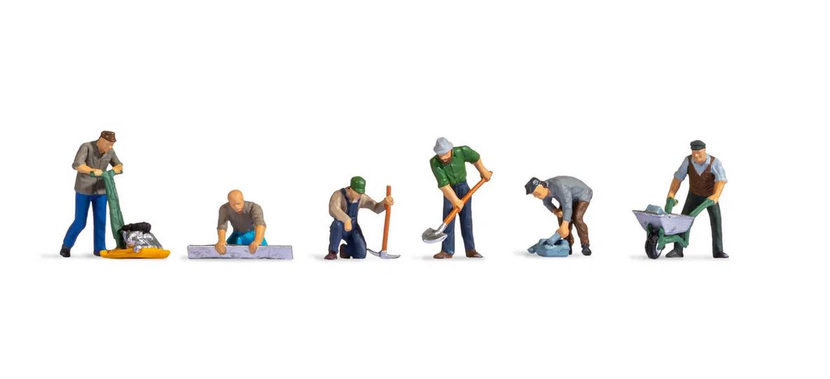 Das Set beinhaltet 6 Figuren als "Straßenarbeiter" im Einsatz. Die sechs handbemalten Figuren im Set führen verschiedene Tätigkeiten aus. 1 Figur schiebt einen Schubkarren. 3 weitere Figuren knien auf der Straße und arbeiten mit verschiedenen Werkzeugen an einer neuen Straße. Ein weiterer "Straßenarbeiter" hält eine Schaufel in der Hand. Ein anderer Arbeiter fährt mit einer Maschine über die frisch geteerte Straße. Die "Straßenarbeiter" arbieten fleißig, damit schnell eine neue Straße entsteht.