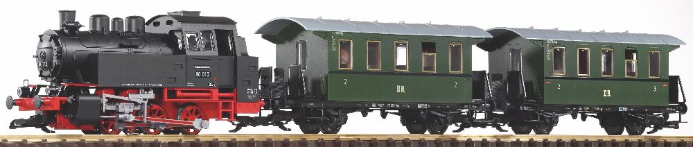 Das Start-Set enthält eine attraktive Dampflok BR 80 und 2 Personenwagen in DR Beschriftung. Die kraftvolle Dampflok verfügt über einen fahrtrichtungsabhängigen Lichtwechsel. Die Lok ist bereits mit realistischem,analogem Sound und schaltbarer Dampffunktion ausgestattet. Die Soundfunktion ist durch zwei beiliegende Schaltmagnete, #35268 steuerbar. Außerdem besitzt die Lok kugelgelagerte und verchromte Radsätze. Dem Set liegt ein Handentkuppler. # 36039, bei. Er dient dem einfachen Entkuppeln der Fahrzeuge. PIKO G Artikel sind für drinnen und draußen geeignet und tragen zu Recht das Prädikat "wetterbeständig"