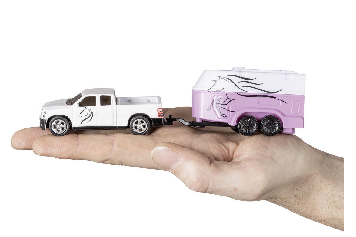 Mini RC Pick-Up mit Pferdeanhänger und präziser GHz-Fernsteuerung. Fahrzeug mit robuster Metall- Karosserie. Mit Akku und Ladegerät. 20 Minuten Fahrzeit mit einer Akkuladung. Ca. 17 cm Länge. Ab 6 Jahren.