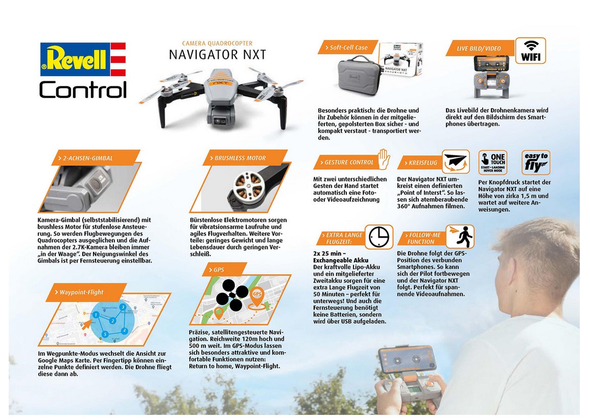 Mit dem hochwertigen GHz-Quadrocopter Navigator NXT haben Hobby-Piloten und Fotokünstler ganz neue Möglichkeiten für perfekte Aufnahmen aus der Luft und genießen dabei einfaches Fliegen mit jeder Menge technischer Highlights: die perfekte Bild- und Videoqualität der 2.7K-Kamera wird durch einen 2-Achsen Brushless-Gimbal unterstützt, denn der sorgt für absolut ruhige Bildaufnahmen ohne Verwackler. Und auch die Motoren des Navigator NXT sind brushless, so dass präzise Flugmanöver perfekt und ohne Verzögerung ausgeführt werden. Die Flugzeit des Quadrocopters beträgt dank kraftvollem LiPo-Akku 25-30 Minuten. Ein mitgelieferter Zweitakku verdoppelt den Flugspaß auf zirka eine Stunde - genau richtig, um unterwegs für alles gerüstet zu sein. Der Qaudrocopter und das Zubehör werden mit einer Softcell-Box geliefert, die eine unkomplizierte, sichere Mitnahme der Ausrüstung garantiert. Perfektioniert wird das Modell durch Eigenschaften wie Follow-Me, Orbitalflug-Funktion, Flug nach Wegpunkten und vielem mehr.