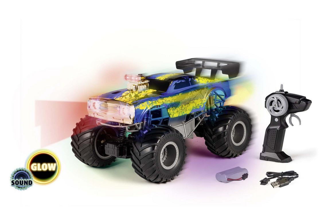 2-Kanal RC Car mit 2,4 GHz-Fernsteuerung. Komplett beleuchtete Fahrzeugkarosserie. Robustes Chassis mit Off-Road-Reifen. Lange Fahrzeit!