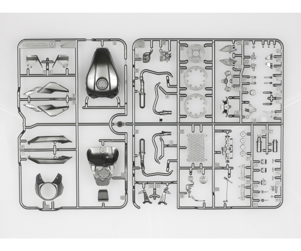 - Die metallbeschichteten Teile des Originalmotorrads, wie Auspuff, Scheinwerfer, Standrohre der Vorderradgabel und Seitenspiegel, werden durch metallbeschichtete Teile dargestellt.