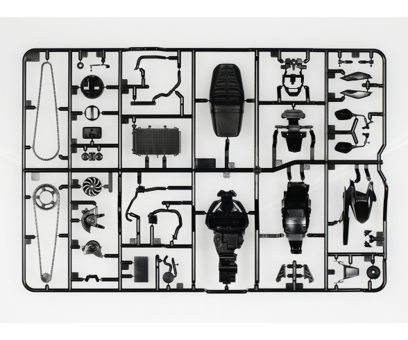 - Ein transparentes rotes Teil bildet das markante Rücklicht nach und transparente Teile bilden den Ring um den Scheinwerfer, die Scheinwerferoberfläche, das LCD-Display und die Frontscheibe nach