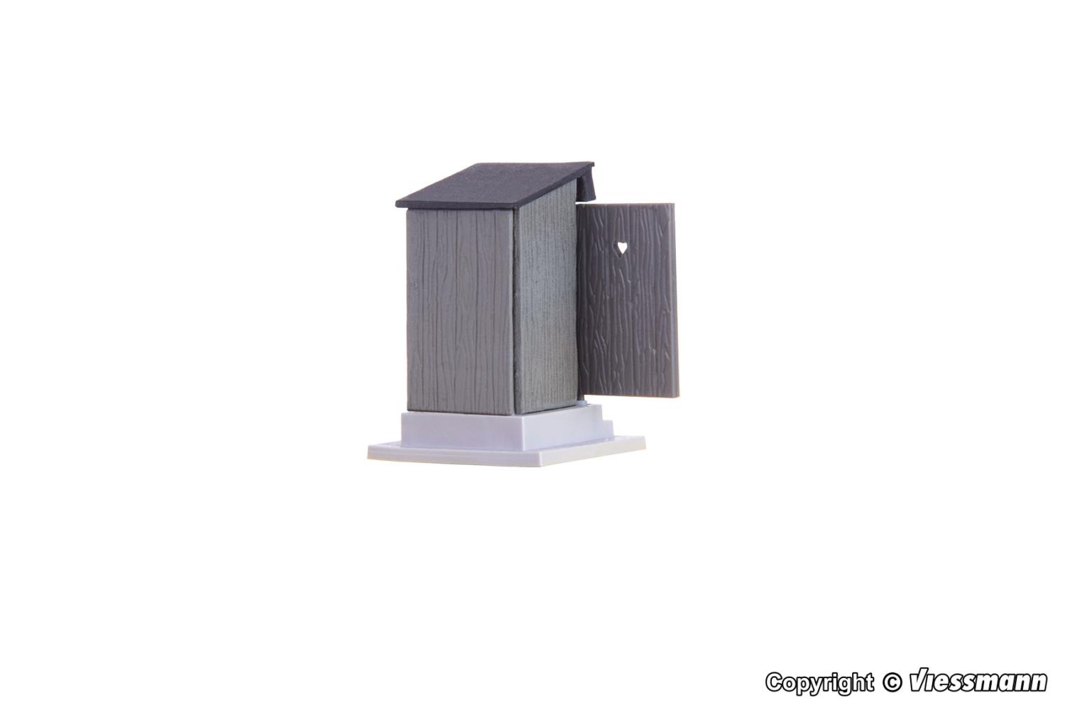 Klohäuschen mit bewegter Tür. Die Tür wird durch einen elektrischen Unterflurantrieb geöffnet und geschlossen, z. B. ausgelöst durch einen vorbeifahrenden Zug. Inkl. weiterer Figuren zum Wechseln. Einbautiefe: 42 mm.