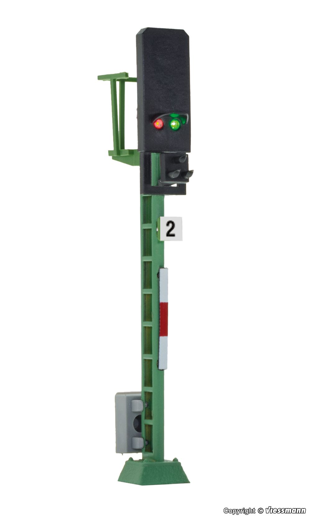 Signal der Einheitsbauart. Filigraner Messingmast in originalgetreuer Lackierung. Mit Steckfuß für einfache Montage. Mit 2 LEDs, wartungsfrei. Signalbilder Hp0 und Hp1. Passendes Steuermodul: Art. 5221. Höhe: 6,1 cm.