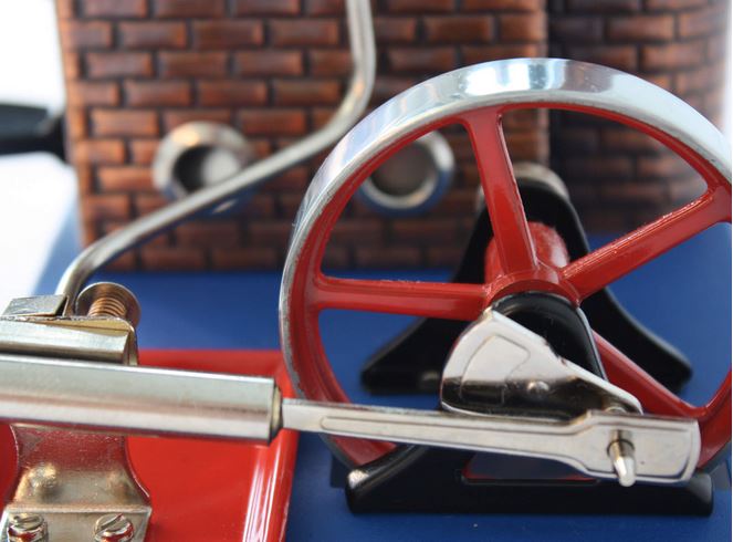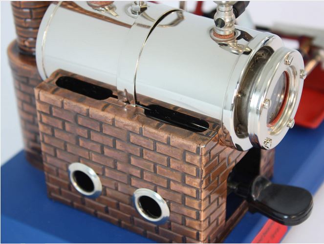 Der Wasserstandsanzeiger in Form eines Schauglases ermöglicht es, den Wasserstand während des Betriebs jederzeit im Blick zu behalten. Der Kessel mit einem Fassungsvermögen von 135 cm³ und einer Größe von 100 x 45 mm bietet genügend Platz für das Wasser und den Dampf, der für den Betrieb der Maschine benötigt wird. Das Schwungrad mit einem Durchmesser von 70 mm sorgt für einen gleichmäßigen Lauf der Maschine.