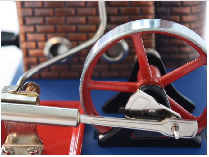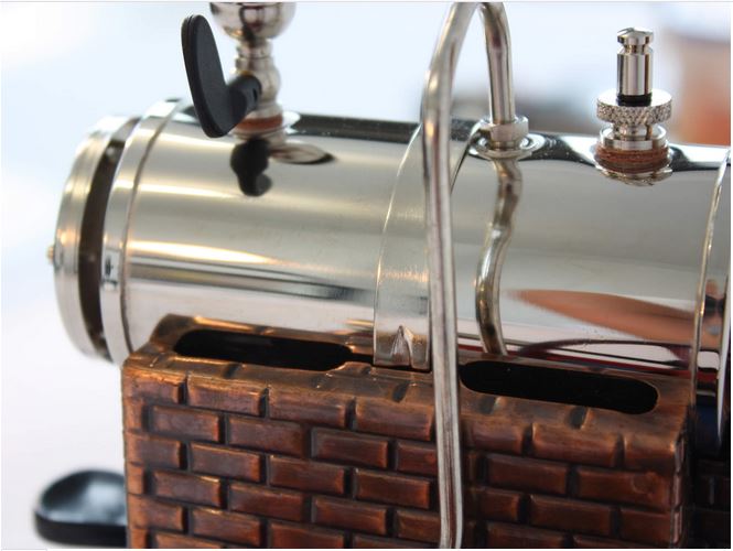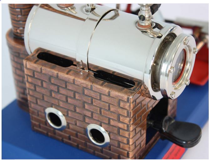 Die Wilesco Dampfmaschine D6 verfügt über einen hochglanzpolierten und vernickelten Messingkessel sowie einen oszillierenden Zylinder. Der Wasserstandsanzeiger ist als Schauglas ausgebildet, somit ist der Wasserstand während des Betriebs jederzeit kontrollierbar. Der Kesselinhalt beträgt 135 cm³ bei einer Kesselgröße von 100 x 45 mm. Das Schwungrad dieser Maschine sorgt mit seinem Durchmesser von 70 mm für einen gleichmäßigen Lauf. Die aufgeschraubte Domdampfpfeife kann während des Betriebes jederzeit über einen speziellen Hebel betätigt werden. Ihr lieblicher Klang erinnert ein wenig an Emma, die Lok aus „Jim Knopf und Lukas der Lokomotivführer“. Beim Montieren des Hebels für die Dampfpfeife Ihrer D6 achten Sie bitte darauf, dass der Hebel aus schwarzem, hitzebeständigem Kunststoff nach außen zeigt, so können Sie während des Betriebes den Hebel betätigen, ohne den Kessel zu berühren.