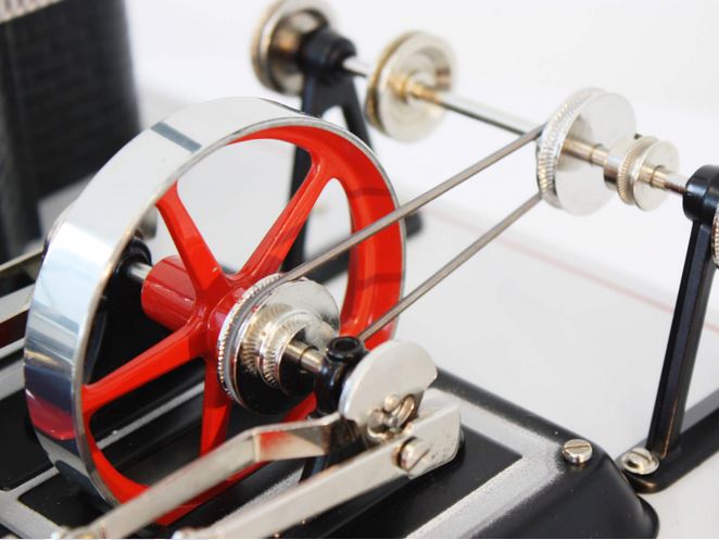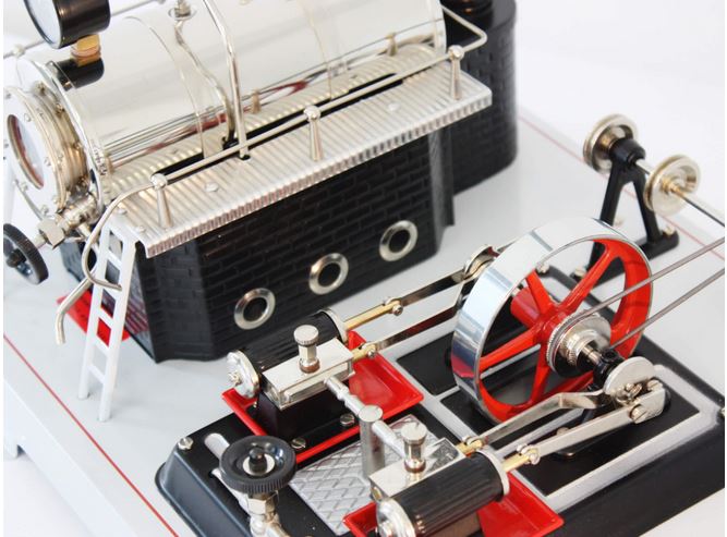Eine der stärksten Maschinen im WlLESCO-Sortiment ist diese selbstanlaufende Zwei-Zylinder-Dampfmaschine. Der Kessel in den Maßen 6,5 x 16 cm hat ein Volumen von 530 ccm. Das Triebwerksaggregat ist auf einem erhöhten Sockel installiert. Die beiden Zylinder werden über ein gemeinsames Dampfabsperrventil gesteuert. Als Sonderausstattung hat die Maschine eine Transmission mit fünf Schnurlaufrollen in drei unterschiedlichen Größen.