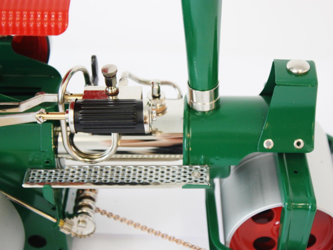 Laufsteg, Kettenlenkung und Getriebekupplung sind selbstverständliche Details unserer Old Smoky. Die Kupplung - links neben dem Führerstand durch eine Stange zu bedienen - ermöglicht, dass die Dampfwalze auch als ortsfeste Dampfmaschine betrieben werden kann. Dabei ist die Old Smoky mit ihrem 230 ccm Kessel stark genug, um sowohl im mobilen Betrieb Zubehör zu ziehen als auch im stationären Betrieb Antriebsmodelle anzutreiben. Die Aluminium-Walzenräder dieses Dampfrollers sind eloxiert und lackiert.